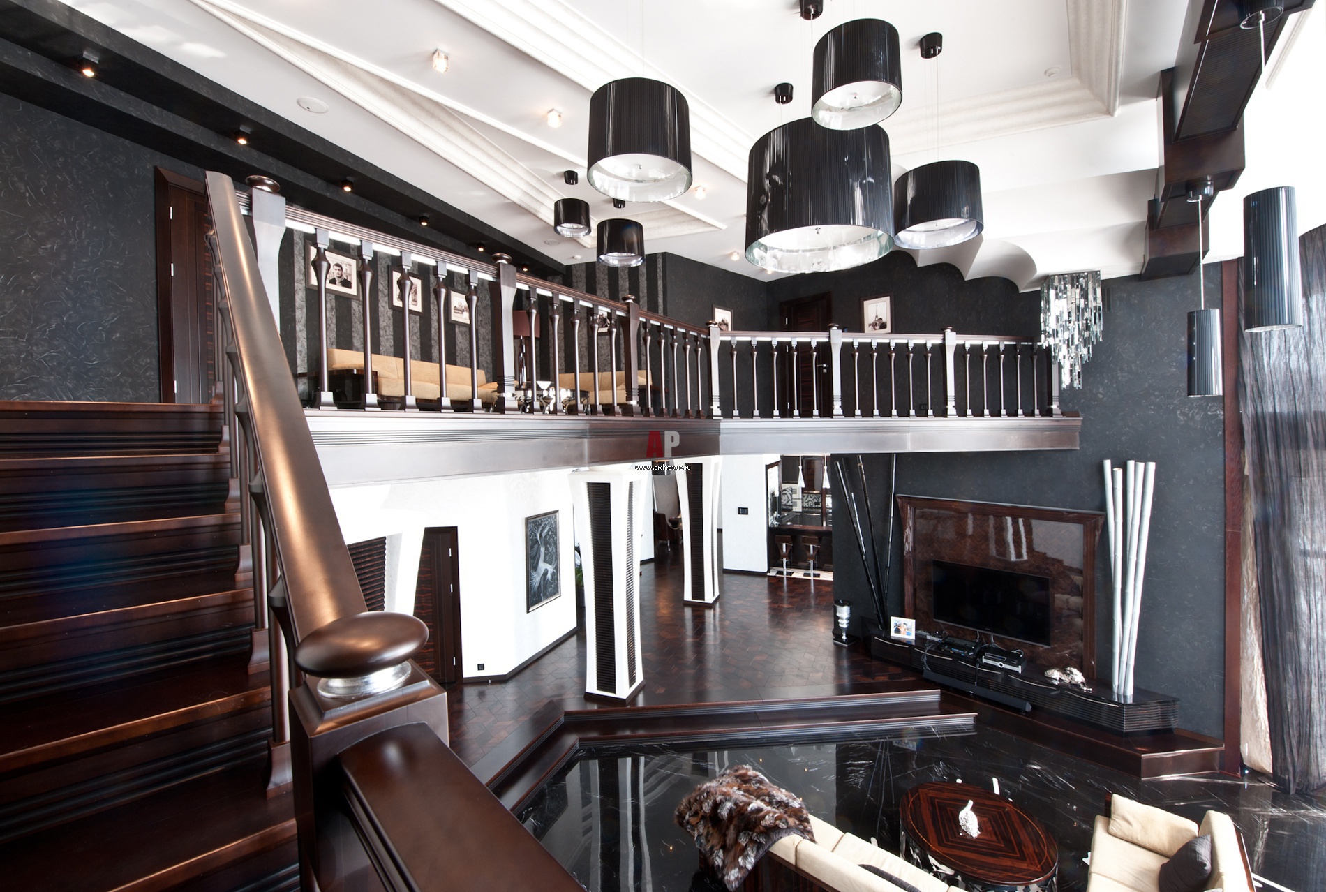 Лестница сложной конфигурации и ограждение балкона второго этажа выполнены на заказ из темного дерева, изготовление «Лигнаур». Балясины украшены хромированными деталями. Лестница, перила, облицовка камина и колонн составляют единый пластический ансамбль.