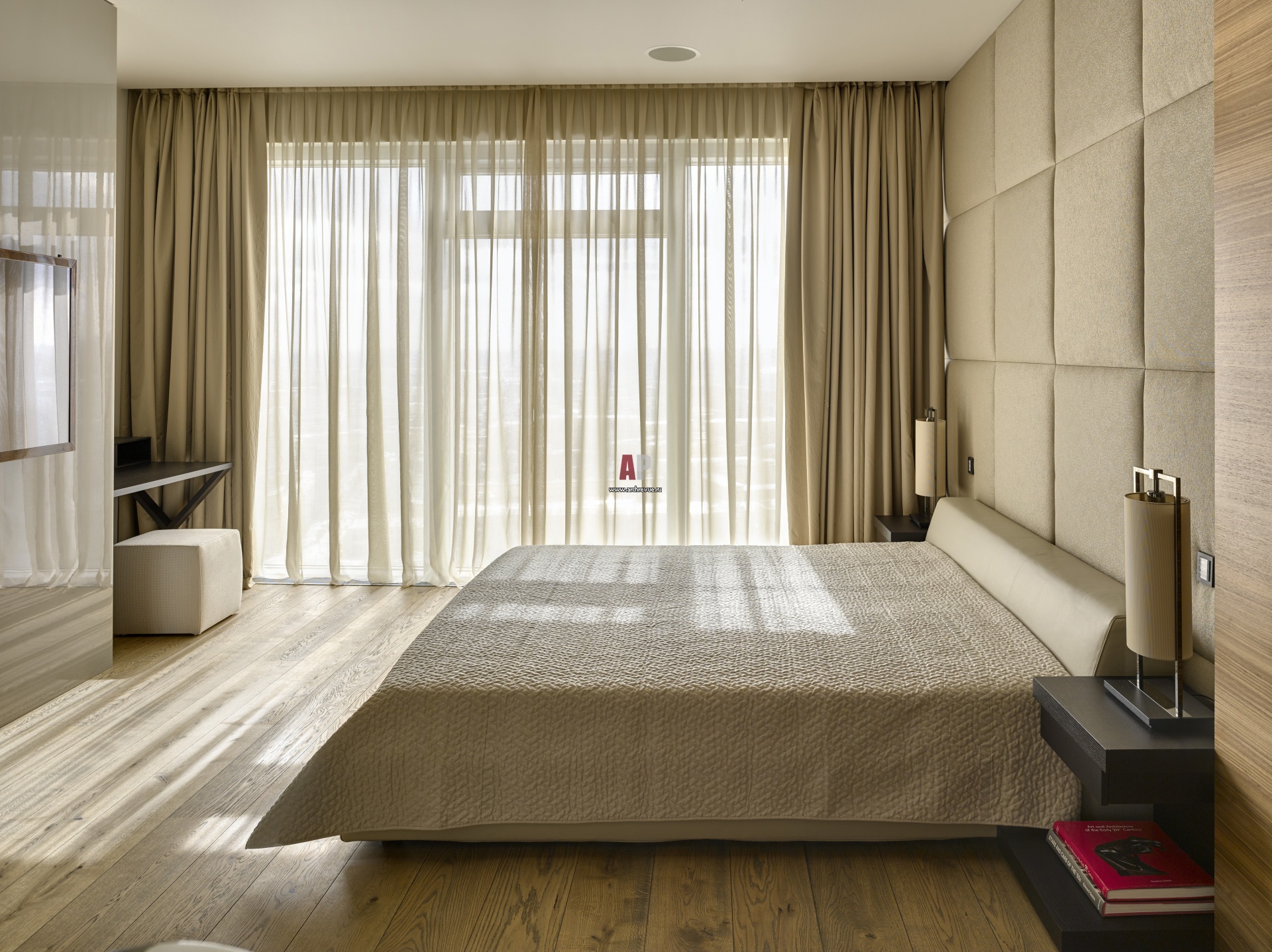 Интерьер спальни. Стена за изголовьем кровати до потолка отделана мягкими панелями из серовато-бежевой замши, остальные стены облицованы панелями. Кровать, Meridiani.