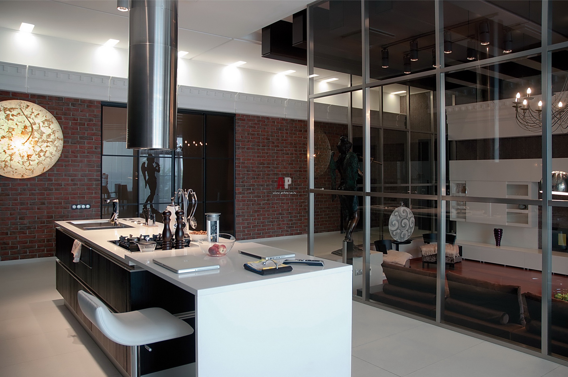 Вид со стороны кухни на входную зону. Остров кухни оформлен дизайнерской вытяжкой из хромированного металла.