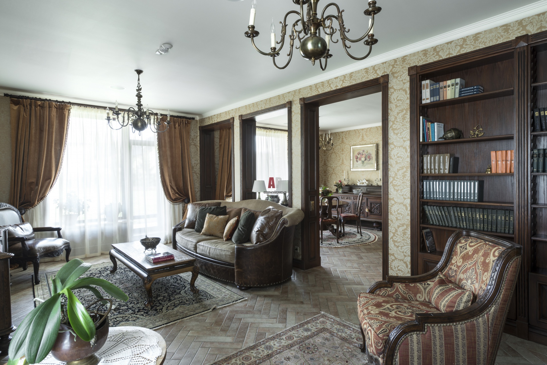 Гостиная с каминной зоной, столовая и кухня расположены в отдельных помещениях, объединенных открытыми широкими порталами. Между гостиной и столовой три открытых дверных проема.