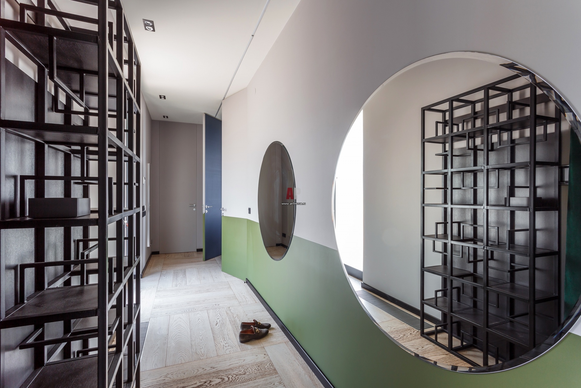 Интерьер прихожей масштабируют зеркала-иллюминаторы большого размера. Металлический стеллаж выполнен местными мастерами по эскизам автора проекта. На полу - дубовая доска, модули, поставщик «Олимп Паркета».