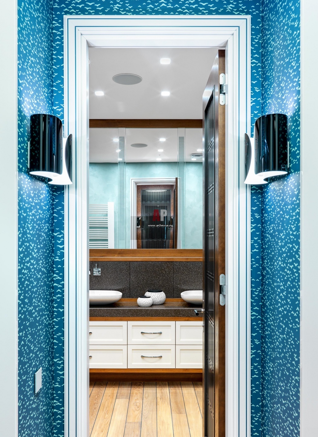 Интерьер семейной квартиры с синими стенами и настроением ар-деко