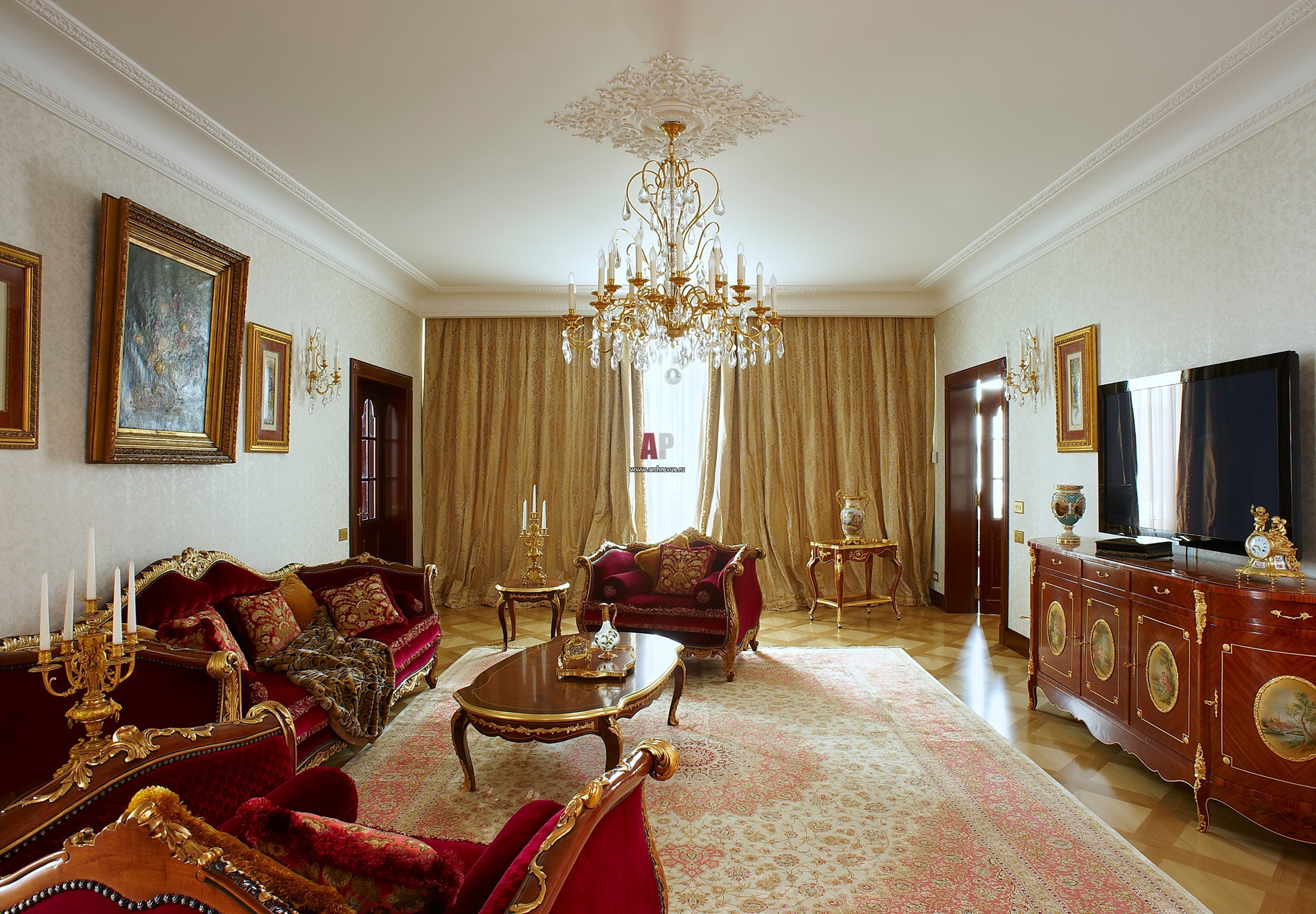 В гостиной парадный настрой задает мягкая мебель в духе Людовика ХV. Диван Francesco Molon. Комод CG Capelletti. Обивка дивана и шторы - из ткани Lelievre. Обои Nobilis.