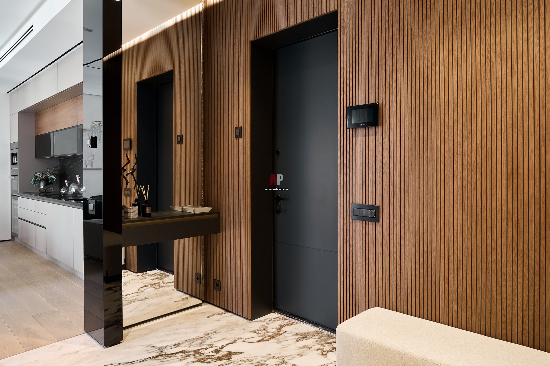 Стены прихожей зашиты реечными панелями. Изделия из дерева, консоль, на заказ. Керамогранит, Arch-Skin.