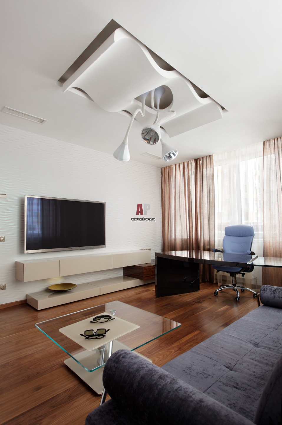Зона отдыха в кабинете. Стены в помещении выкрашены в белый цвет. На полу – массив американского ореха, поставщик «Паркет-Холл».