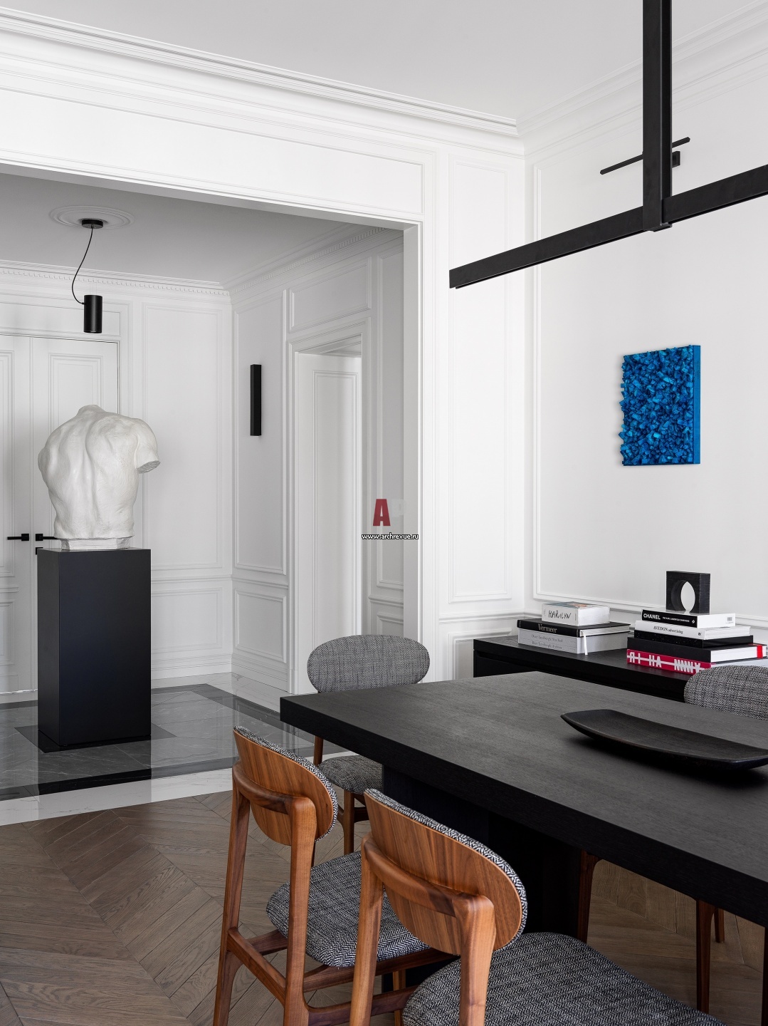 Монохромный и артистичный интерьер с современным искусством на Новослободской. Столовая.