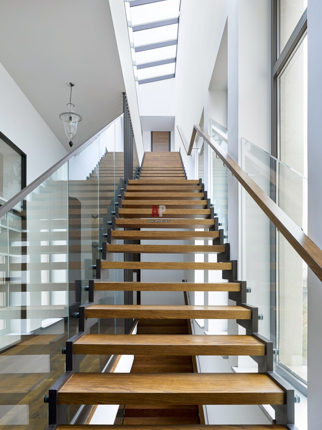 Над лестницей расположено зенитное окно, оно дает свет и ощущение простора.