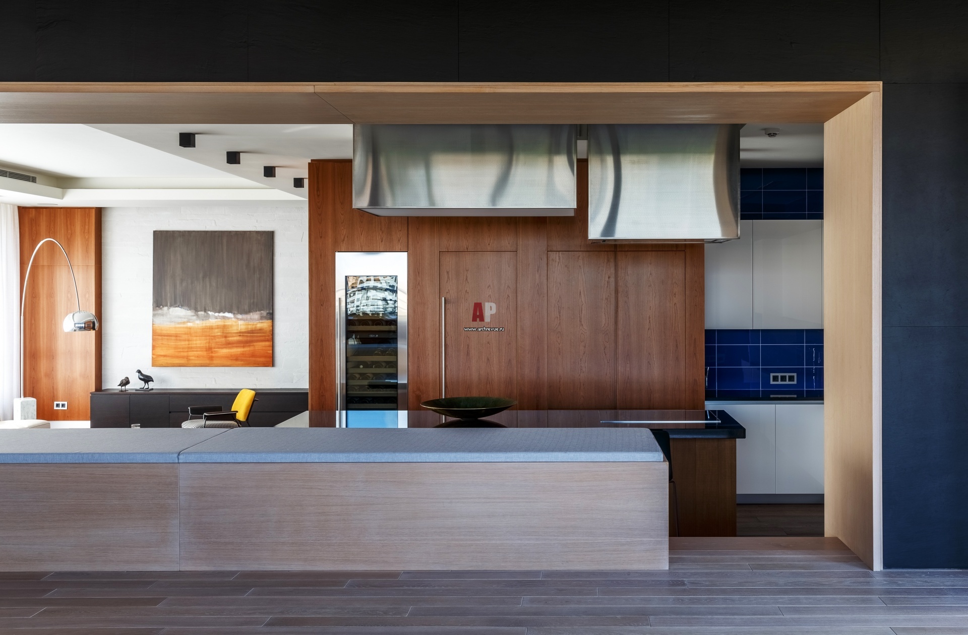 Вид на кухню со стороны столовой. Кухня, Cesar. Над островом два куба из стали, один вытяжка, другой – световой фонарь.