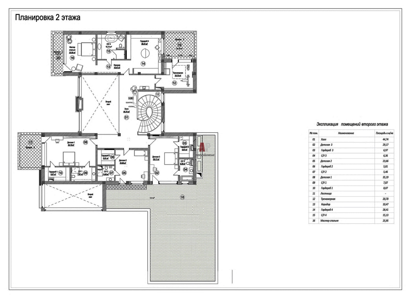 План второго этажа большого двухэтажного дома в духе архитектуры Ф. Л. Райта. Общая площадь - 1200 кв. м.