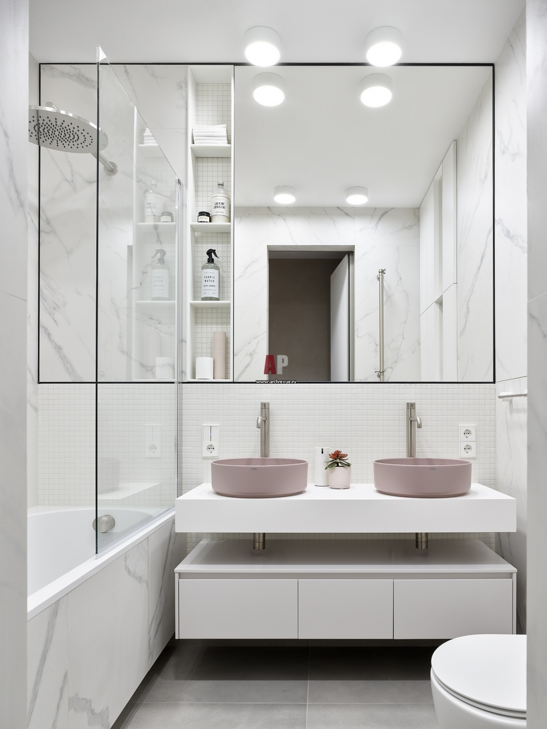 Современный пентхаус для семьи с детьми. Детский санузел с двумя умывальниками и ванной. Розовая керамика, Ceramica Cielo.