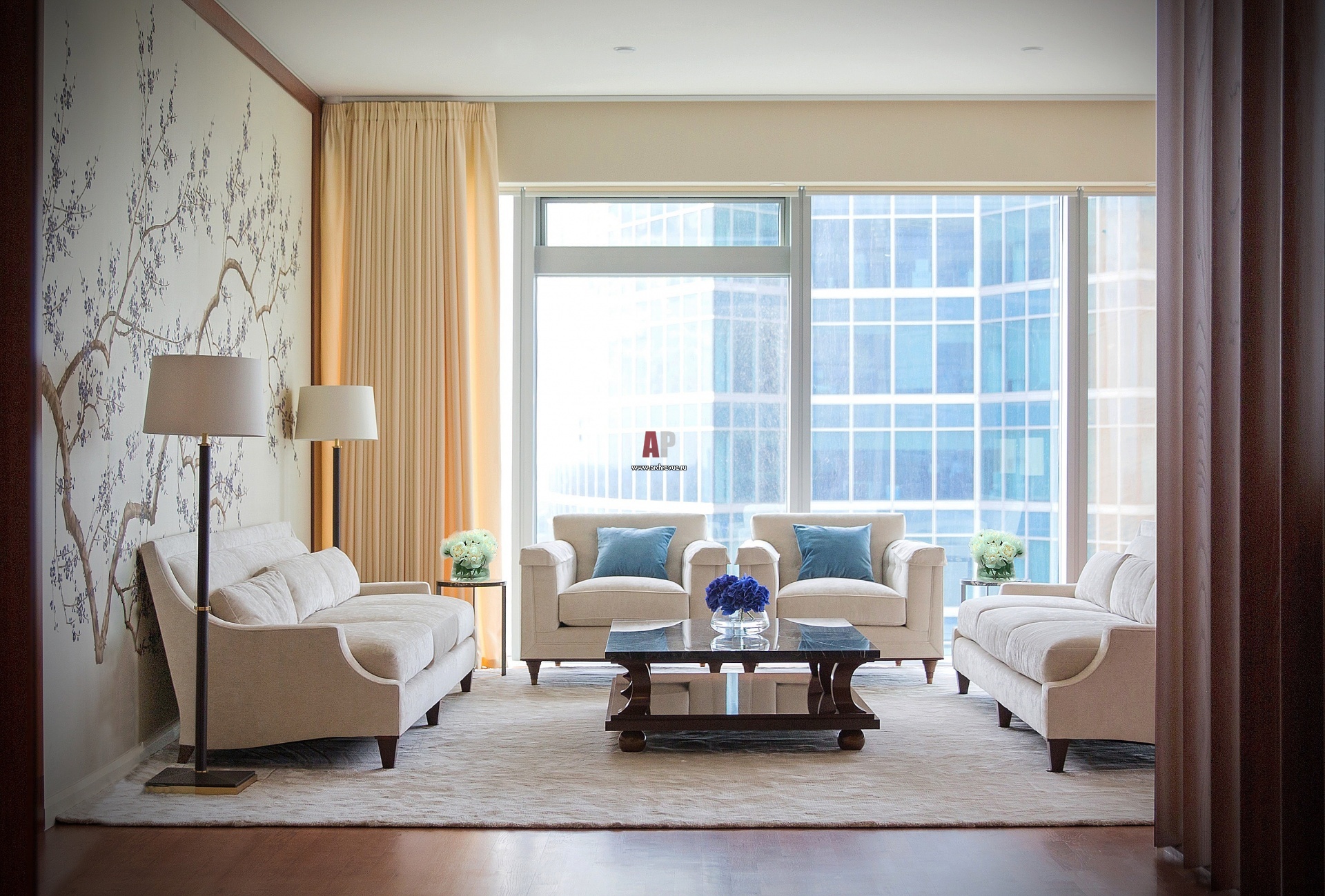Современная квартира с арт-объектами. Интерьер гостиной в бежевых тонах и оттенках слоновой кости. Диван, кресла, кофейный столик, Baker. Торшеры, Baker.