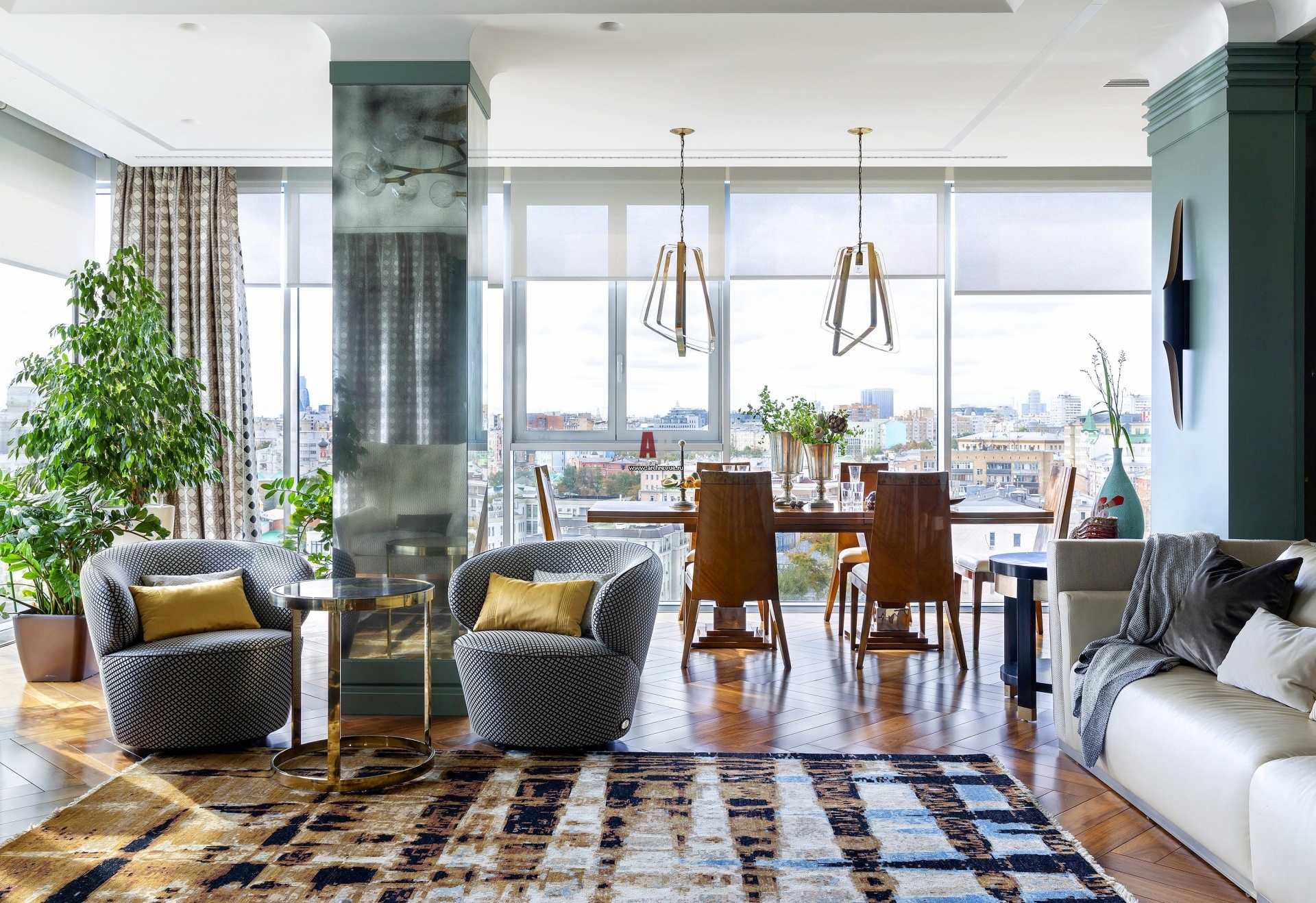 Панорамная гостиная с элементами ар-деко. Потолочный карниз скругленной формы визуально увеличивает потолок. Диван, кресла, Fendi. Круглые столики, Caracole. Люстра, Brabbu. Бра, Delightfull. Встроенные светильники, Panzeri.