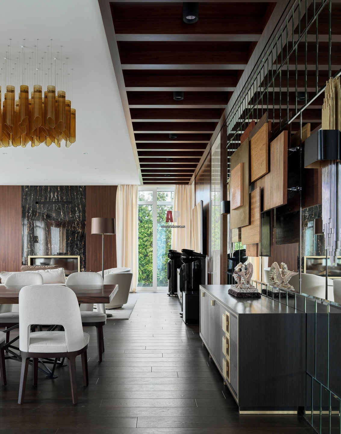 Стены и потолки частично оформлены панелями из шпона ореха. На полу – инженерная доска из тонированного дуба.