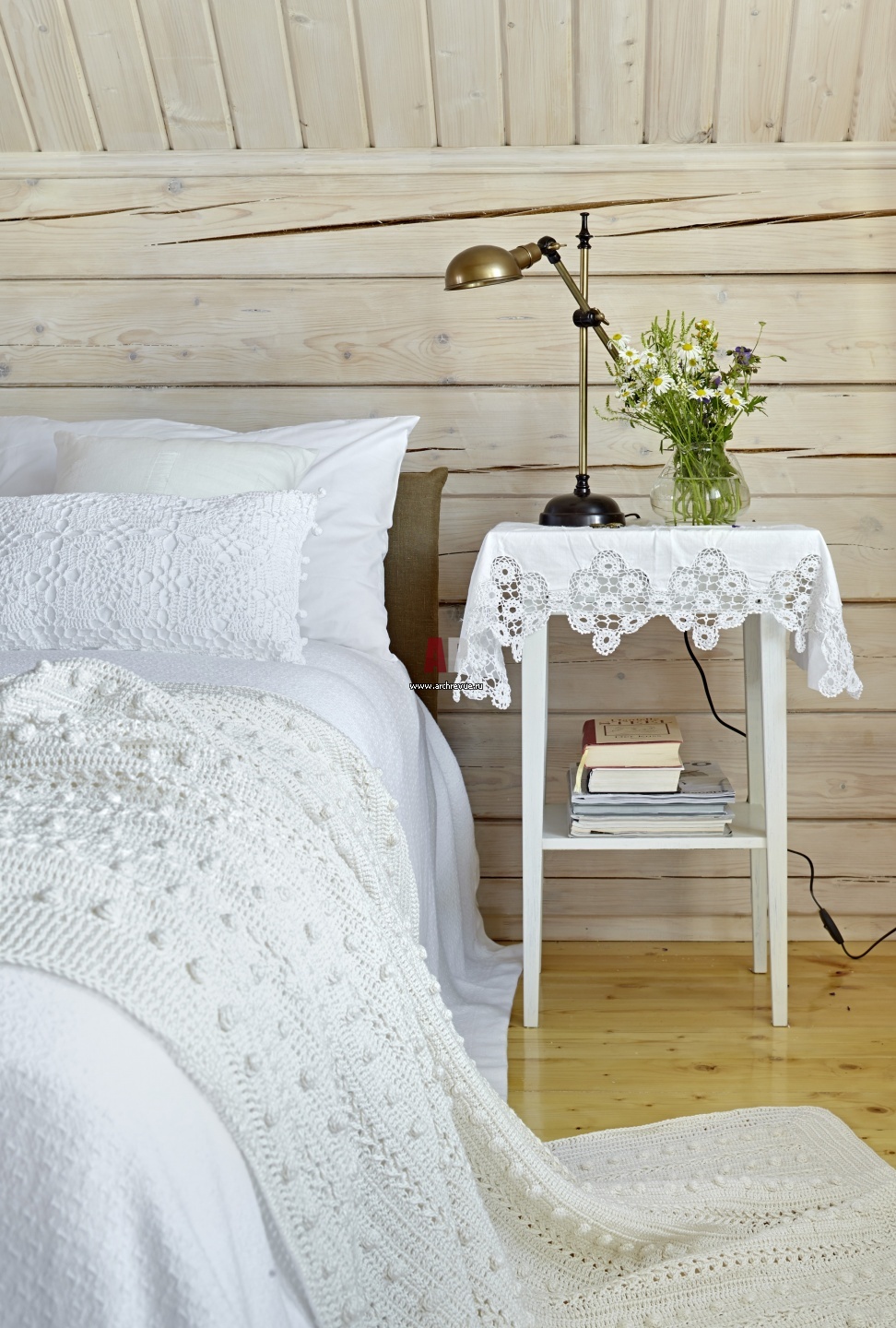 Интерьер спальни. Кровать декорирована белым текстилем в фольклорном стиле.