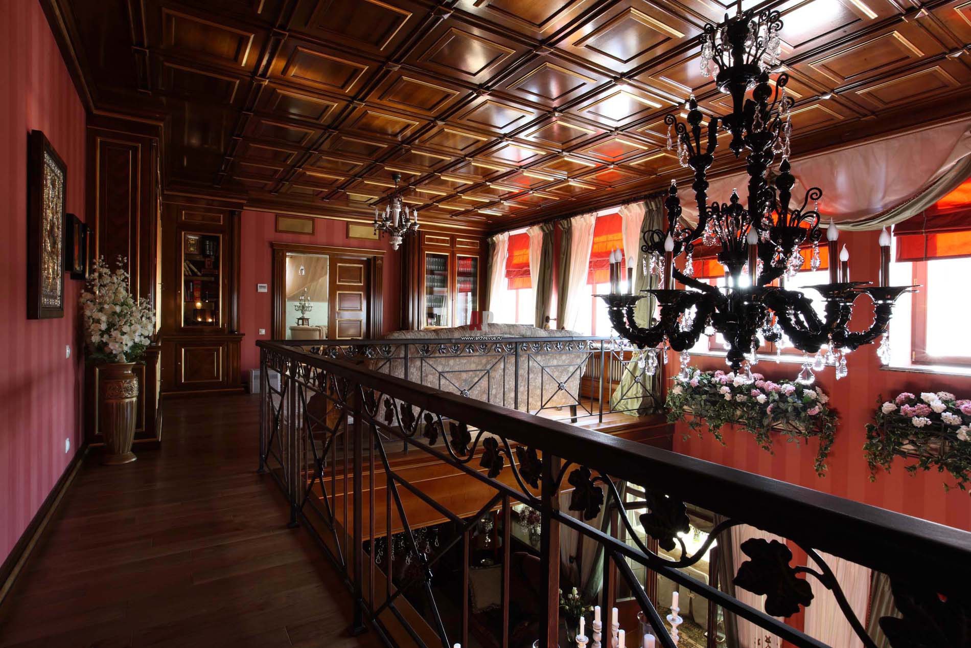 В антресольной части второго этажа расположена библиотека. Книжные шкафы, Elledue. Кованое ограждение с цветочным орнаментом, изготовление BlackSmith.
