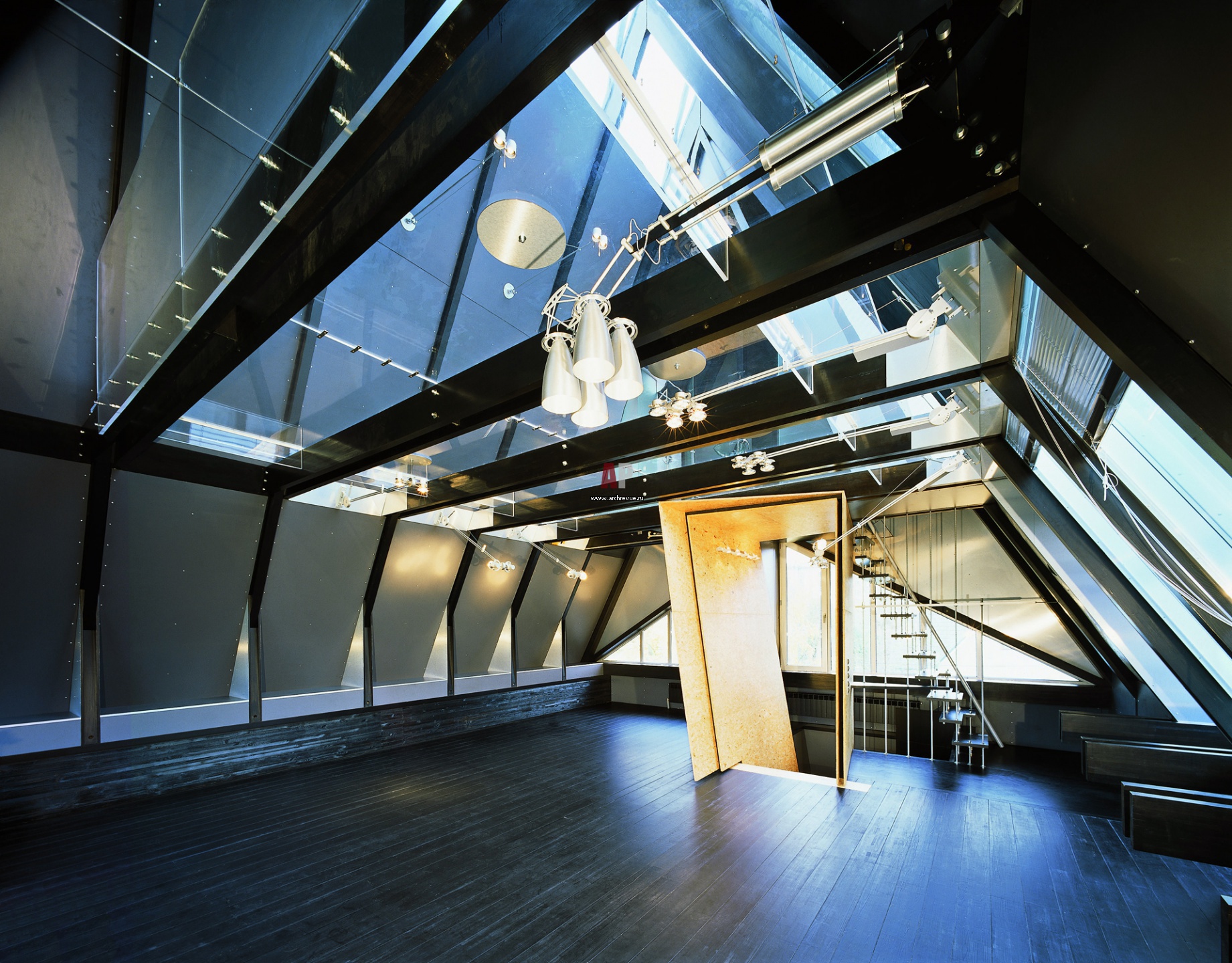 Лестница на третий этаж акцентирована оригинальным порталом. Конструктивистская арка из древесно-стружечных панелей под лаком. Современные светильники из металла.