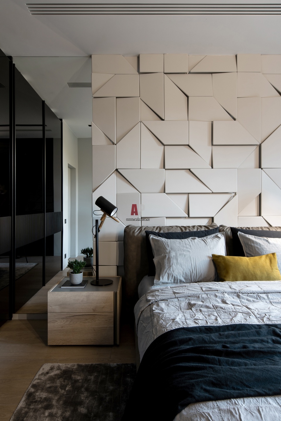 Комната сына. Изголовье кровати в ней выделено с помощью гипсовых панелей фабрики Rifinitura со строгим и брутальным рисунком. Кровать, Tomasella.