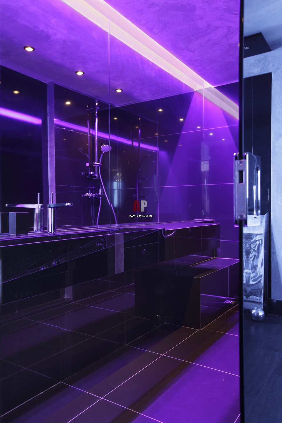 Горизонтальный умывальник облицован черным стеклом. Сантехника, Damixa, поставщик «Сантехника 7».