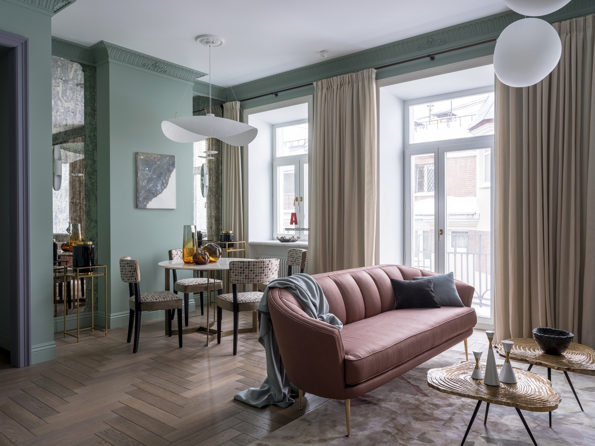 Квартира с романтичным декором и палитрой в пастельных бирюзовых и пыльно-розовых оттенках. Интерьер общей гостиной-столовой. На полу – штучный паркет-«елочка» из дуба. Комод, Any Home.
