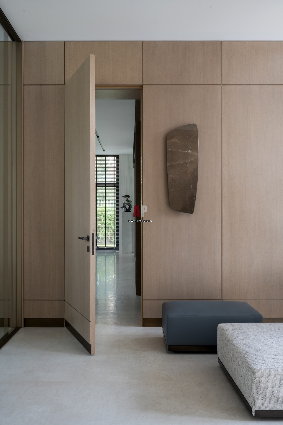 Вход в бассейн из общего холла. Дверь скрыта за дубовыми панелями.