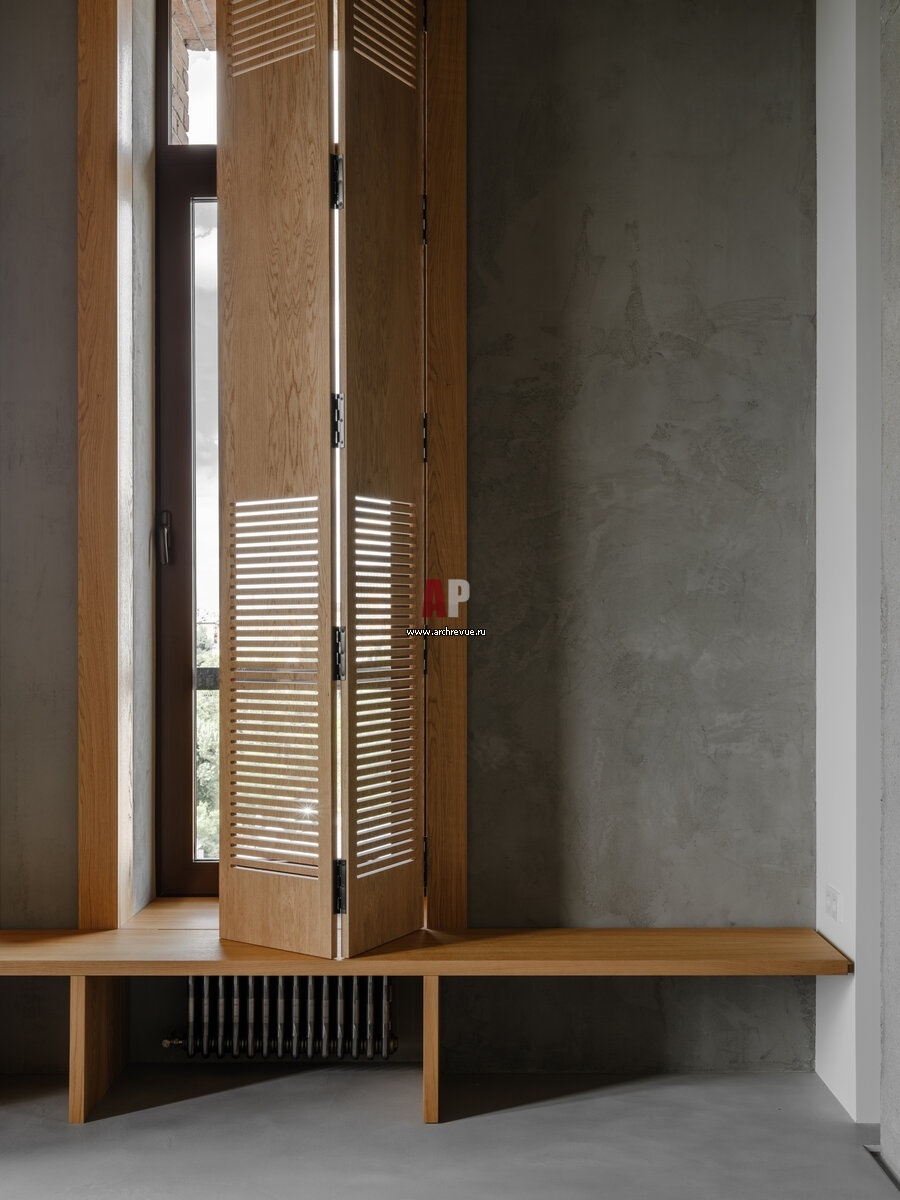 Акцент интерьера – деревянные ставни. Они, как и низкие подоконники-скамейки, выполнены из дерева на заказ.
