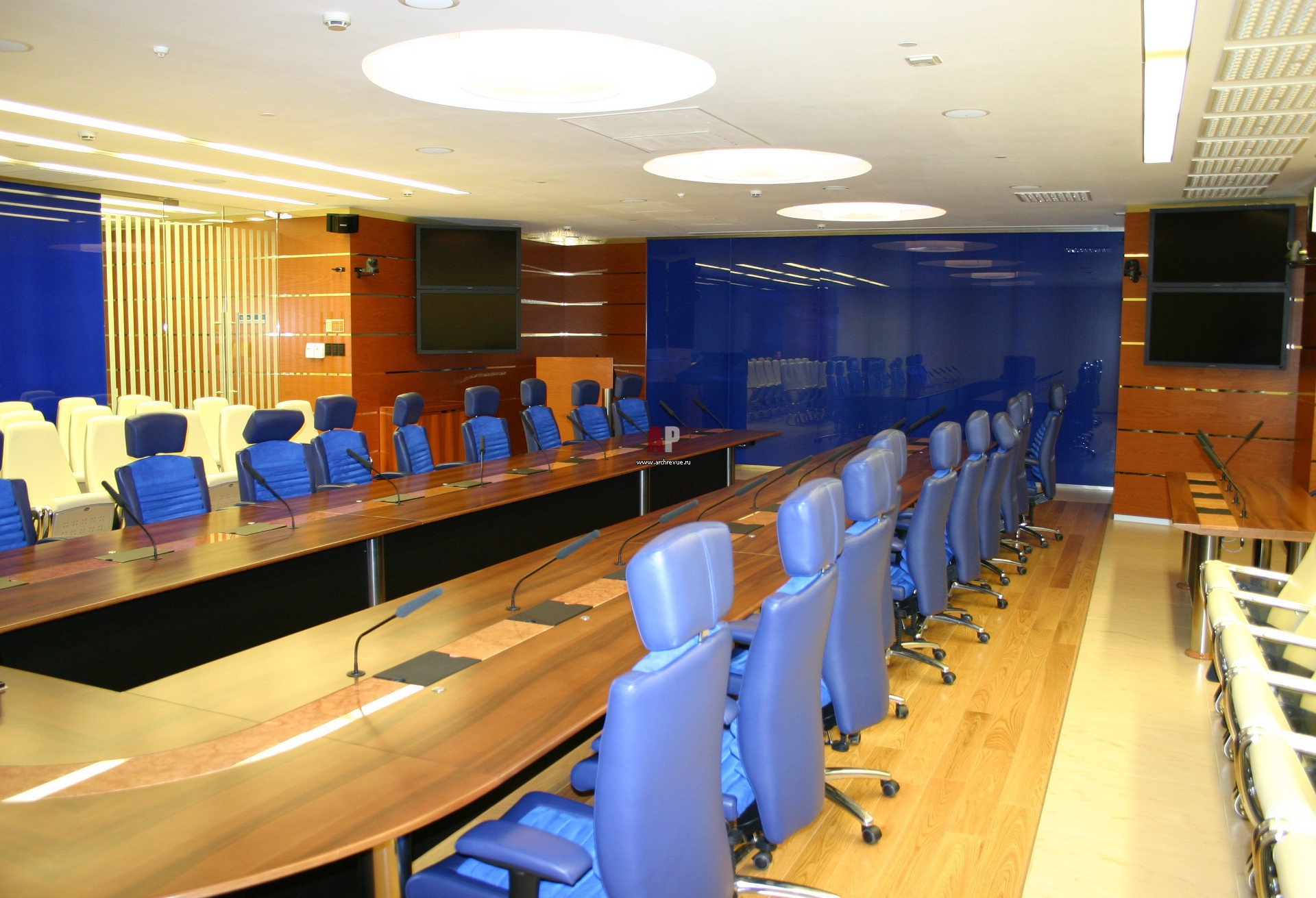 Конференц-залы организованы исходя из количества людей, их должностей и степени участия в обсуждении. За каждым участником конференций закреплено свое место за круглым столом, кресла наблюдателей размещены рядами. Плазменные экраны расположены так, чтобы они были хорошо видны в первую очередь главным участникам обсуждений. Кресла заказывались на медицинских фабриках: они обеспечивают максимальный комфорт даже на многочасовых совещаниях. Длинный стол-брифинг сделан по чертежам российских архитекторов итальянскими мастерами.