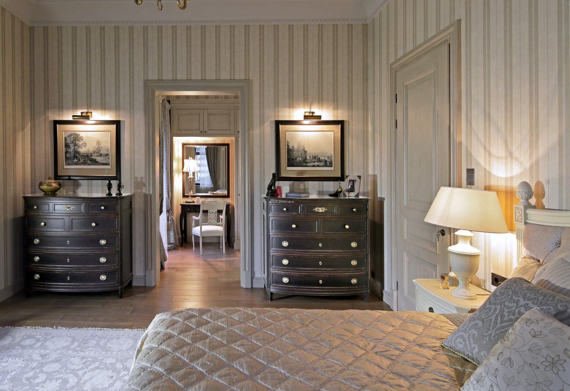 В мастер-спальне обои с полосками разной ширины визуально вытягивают пространство. Камерный вид придает темная с благородными потертостями мебель и старинные гравюры. Кровать, Provasi. Декор, Maitland Smith, поставщик Charles.Cameron; Ralph Lauren, Vaughan.