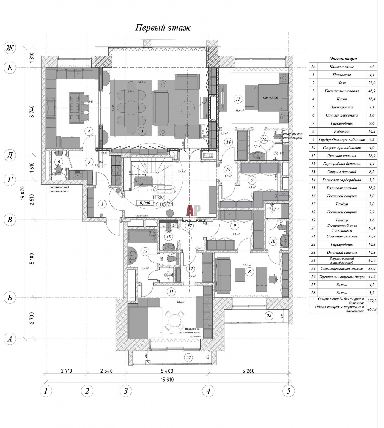 План первого этажа двухэтажной квартиры с террасой. Общая площадь – 324 кв. м, площадь террасы – 136,1 кв. м.