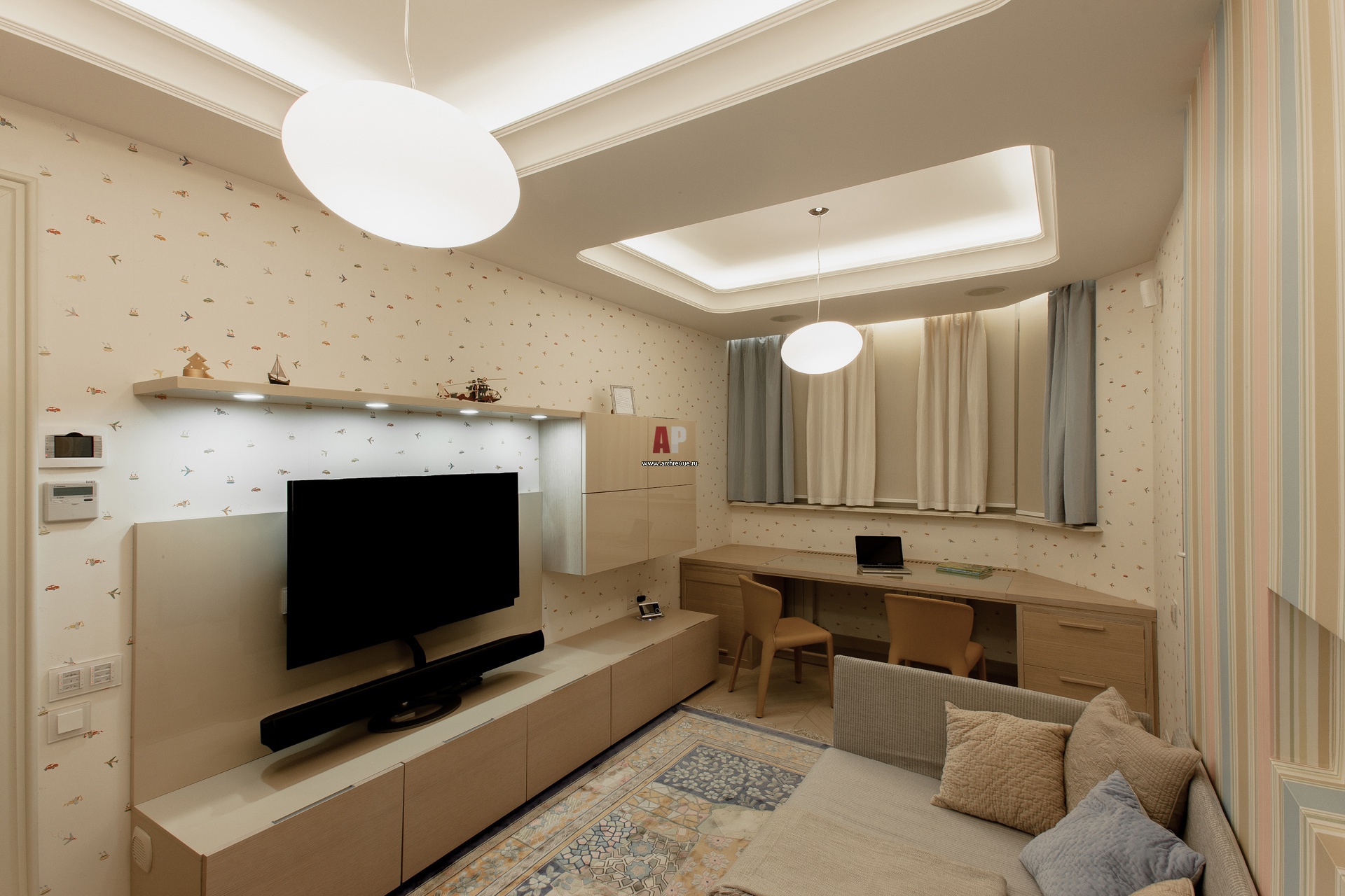 Современная детская комната. Низко опущенная потолочная балка закамуфлирована гипсовыми кессонами. Письменный стол с широкой столешницей (более 80 см). Обои с изображением самолетов и пароходов.