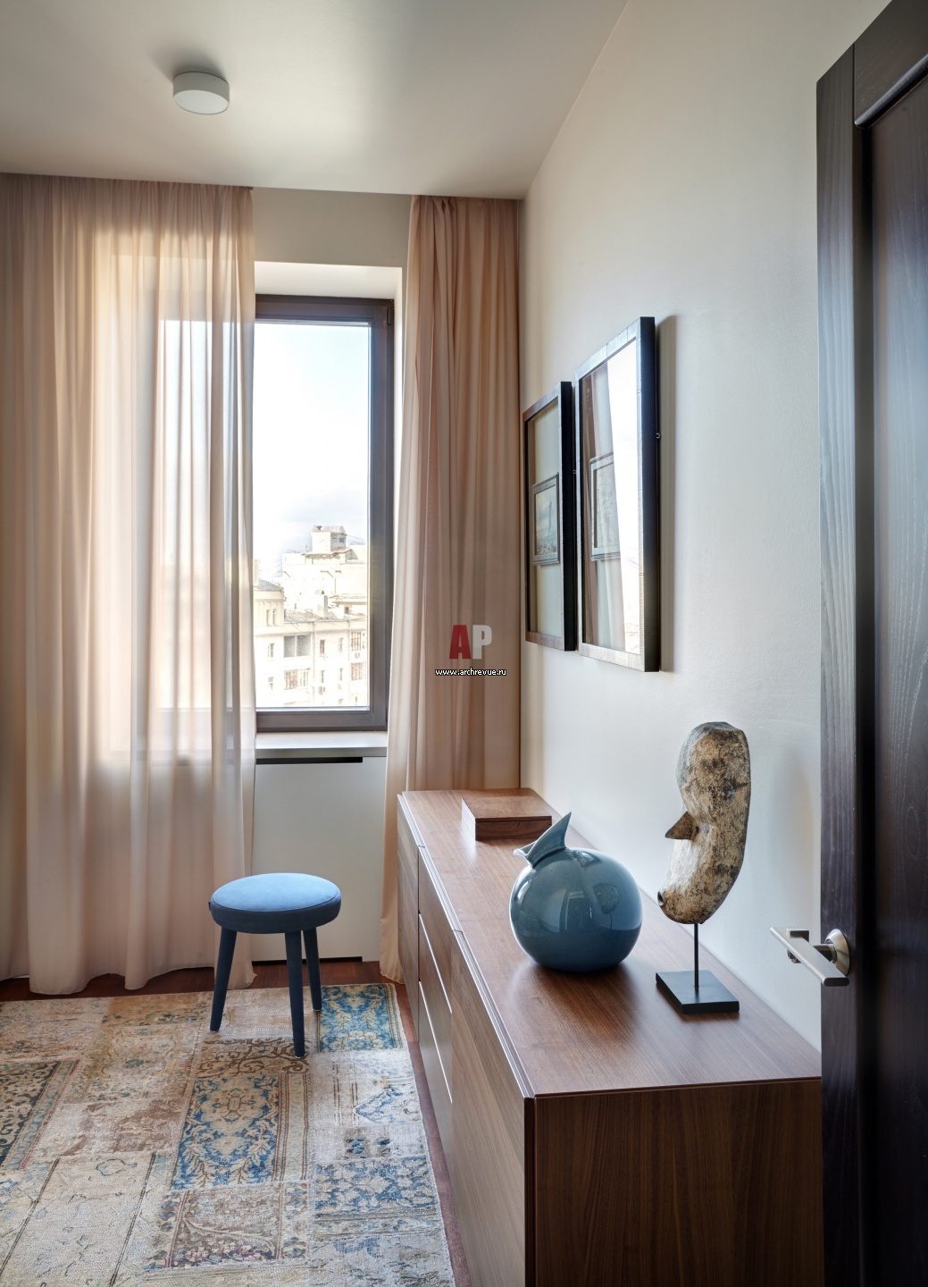 Изначально архитектор хотела сменить оставшиеся от старого ремонта окна в темных рамах на стеклопакеты со светлыми рамами. В процессе она и вовсе сыграла на контрасте темных оконных переплетов, полов и дверей со светлым современным окружением.