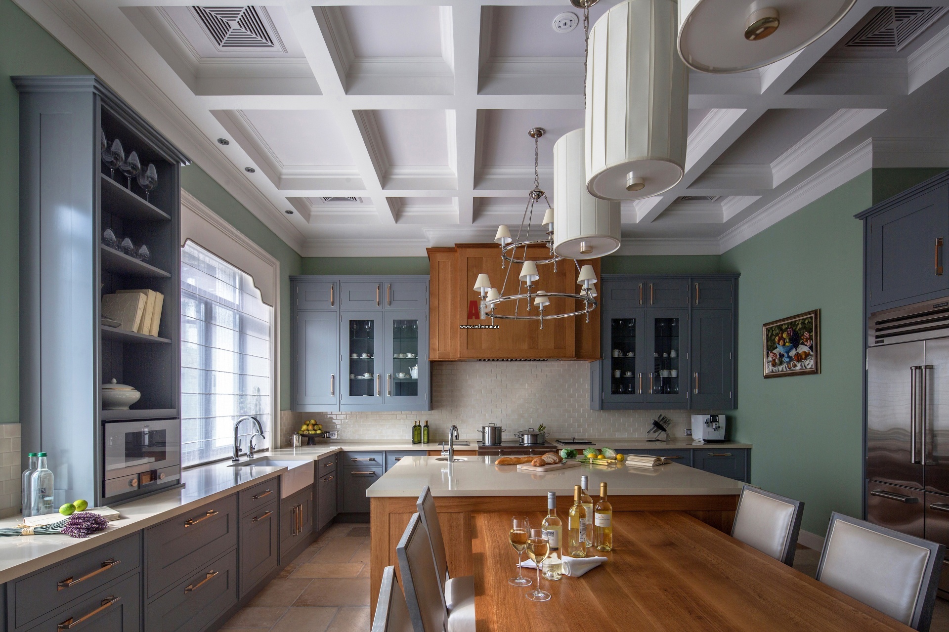 Изолированная кухня оформлена по-английски утилитарно и практично. Стены прокрашены зеленой краской, на полу – натуральный камень. Кухонный гарнитур Christopher Peacock выглядит строго, функционально и добротно, внутри и снаружи он выполнен из массива дуба. Сборка и покраска кухни, служба батлер-сервиса компании Charles.Cameron. Стулья, Vanguard Furniture.