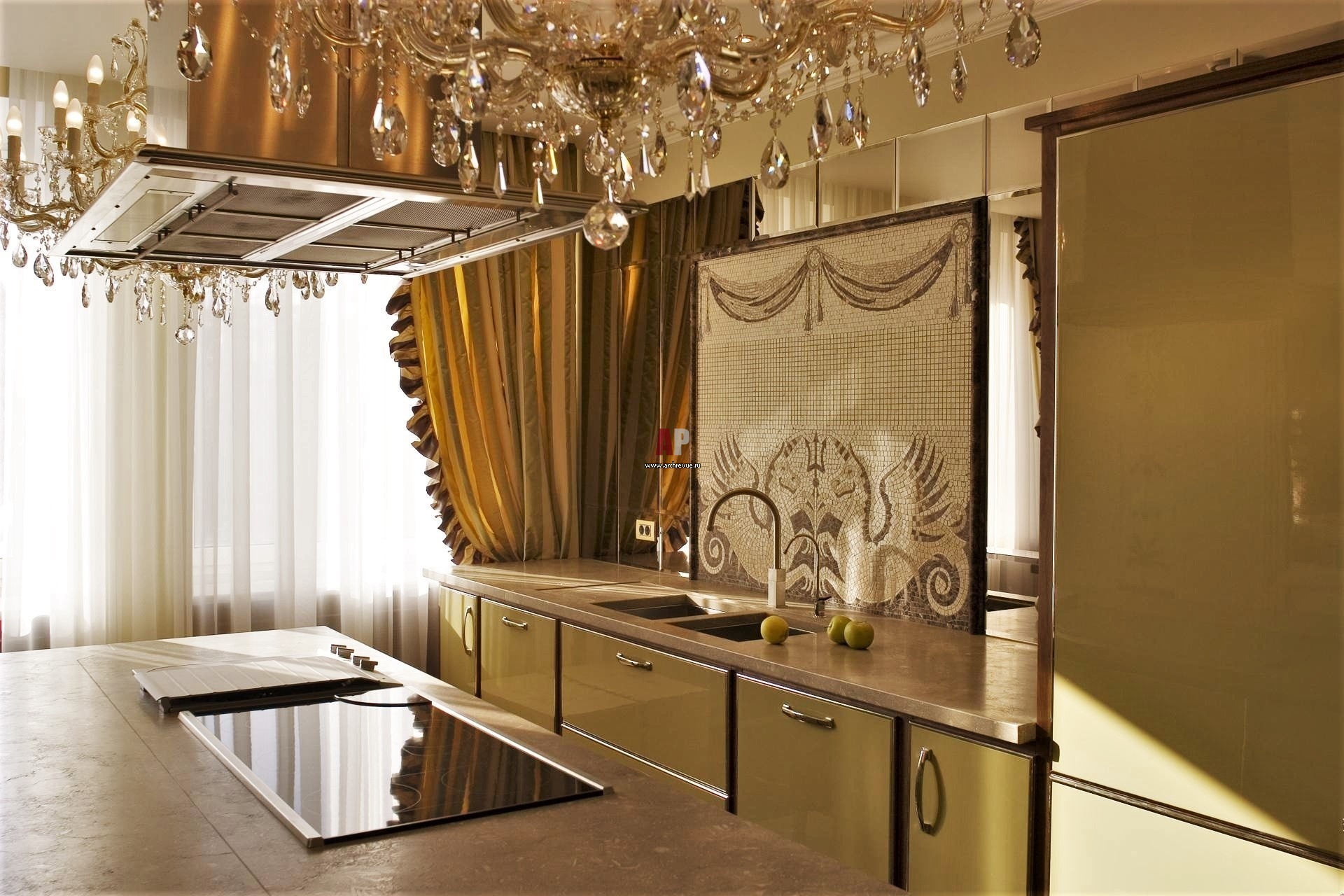 Изолированная кухня меблирована современным гарнитуром Meneghini. По мнению втора проекта, современная кухня более практична, чем классические модели, а на кухне главное – функциональность. Фартук выполнен из фацетного зеркала, панно над мойкой выложено мозаикой Sicis. Деревянные окна, поставщик Vikkers