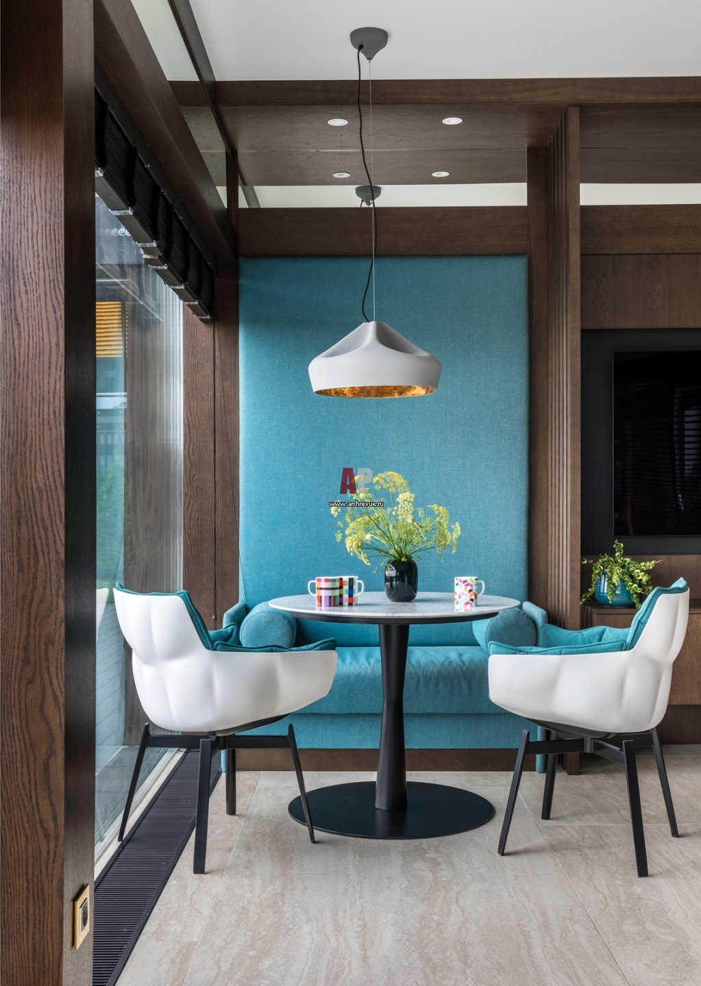 Зона отдыха при СПА с выходом на террасу. Она решена в цветовой гамме турецкого курорта Памуккале, известного своими соляными горами и голубыми озерами. Место для общения тет-а-тет в комнате отдыха. Многофункциональная композиция (мини бар, телевизионная консоль и диван с изголовьем, разделенная вертикальными ширмами) выполнена по эскизам. Кресла, B&B Italia, модель Husk. Стол Poliform, модель Flute. Люстра над столом, Marset.