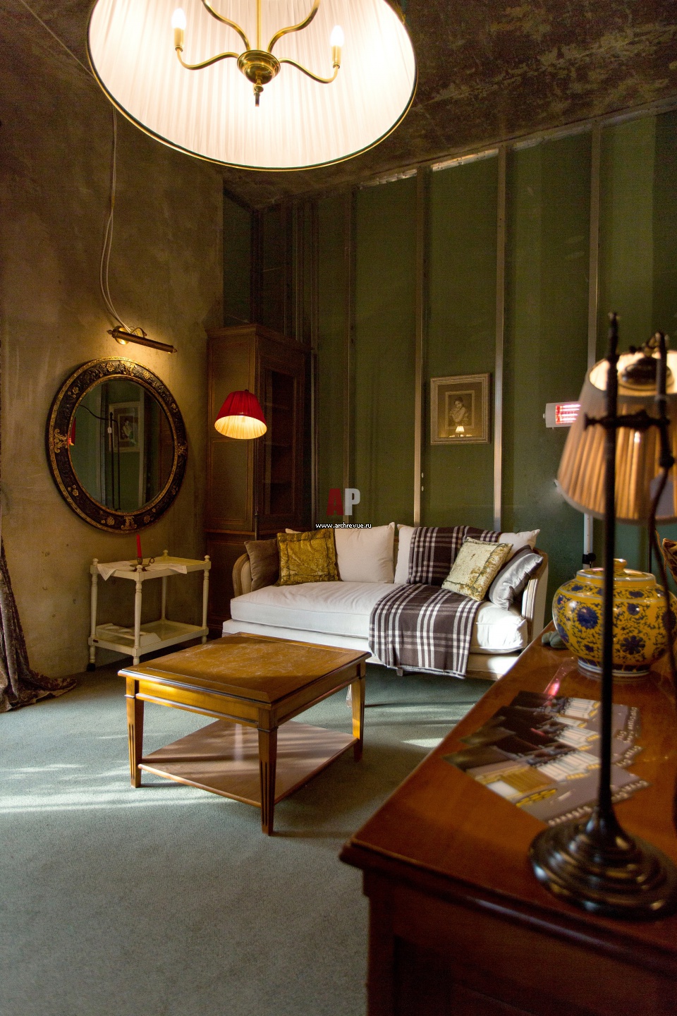 Интерьер гостиной построен на контрасте классической мебели и аксессуаров и индустриальных материалов: бетона кирпича, акрила.