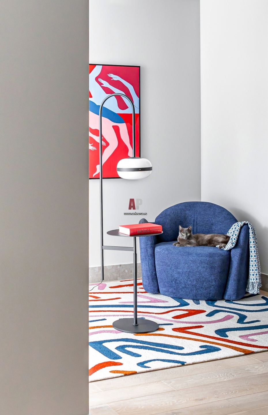 Холл второго этажа. Синее кресло, ковер с ярким рисунком, постер в стиле поп-арт создают хорошее настроение.