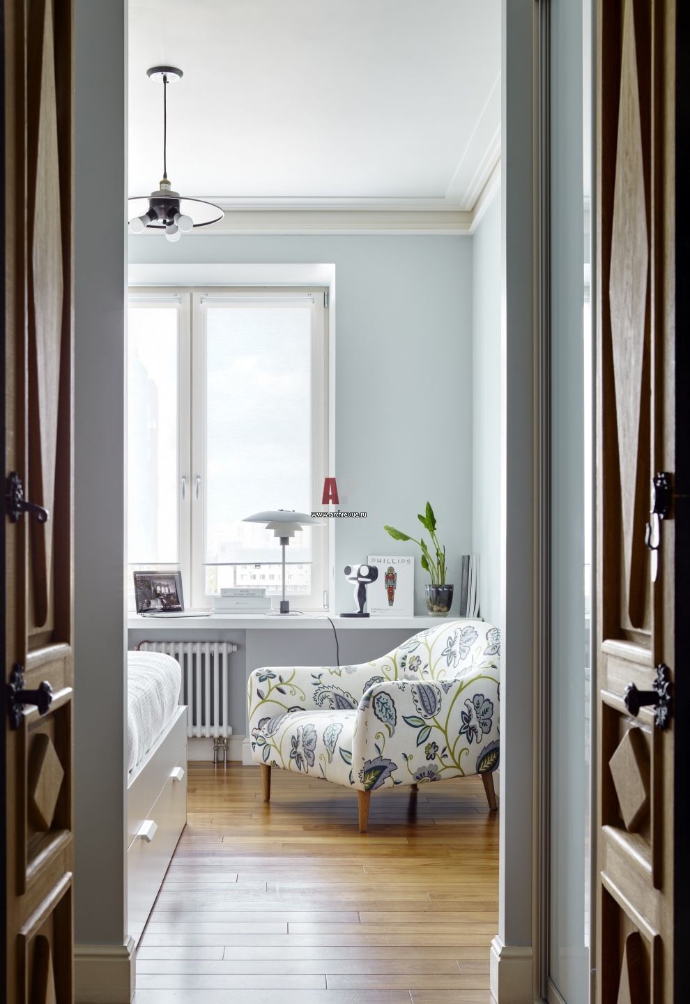 Мансардная квартира для женщины с ребенком. Интерьер детской комнаты. Межкомнатные деревянные двери с декоративными филенками, на заказ, изготовление «Ассоциация русских мастеров». Кресло, Crate and Barrel.