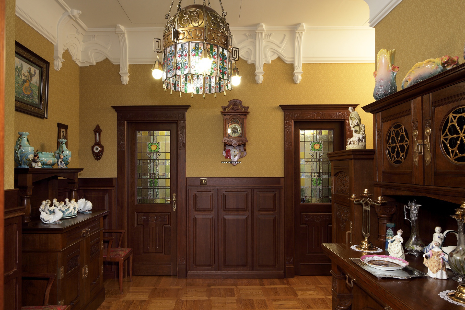 Фото холла. Массивные дубовые двери с резьбой и витражами выполнены по эскизам авторов проекта.