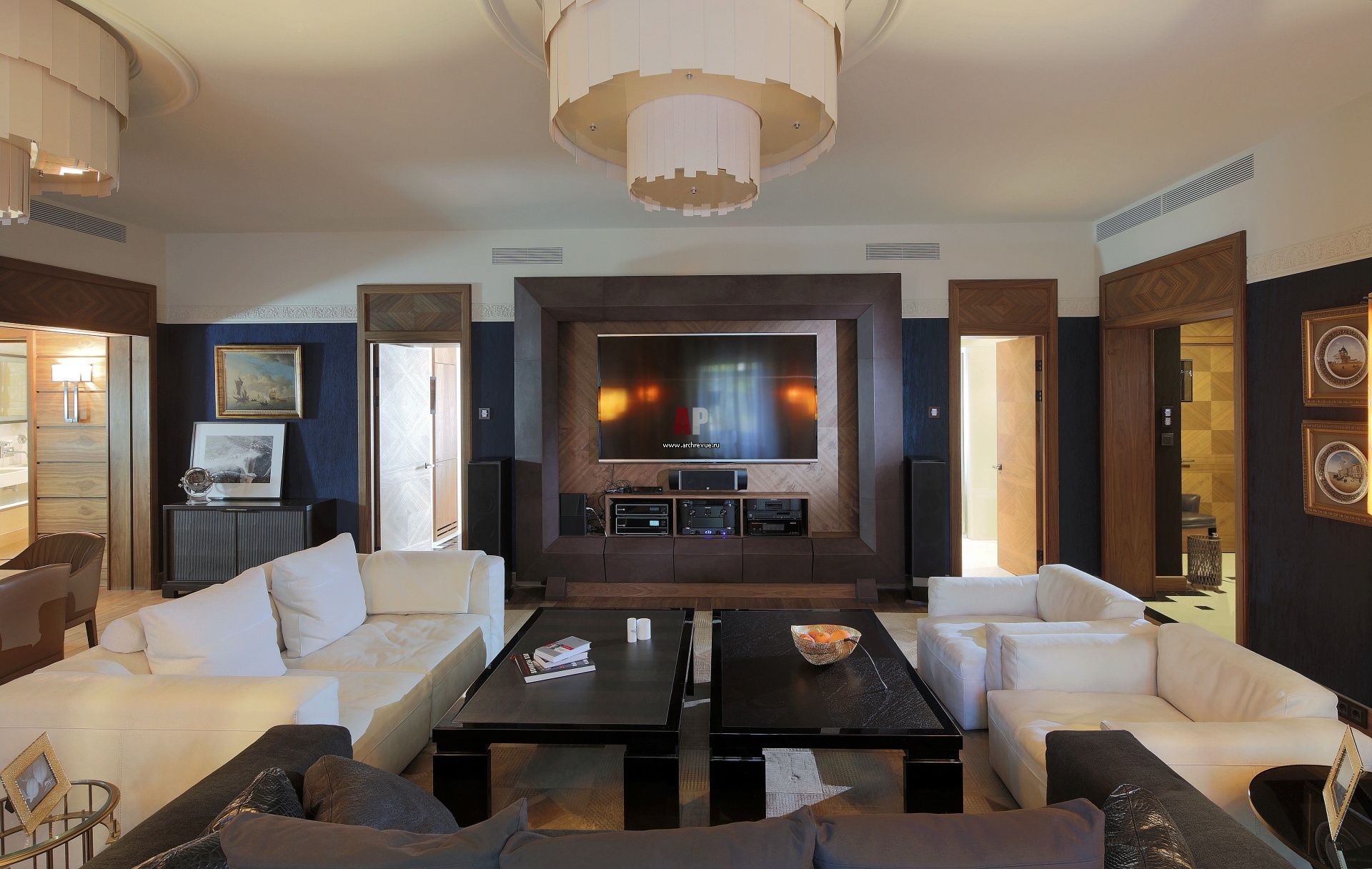 Интерьер гостиной. Стойка из массива ореха под акустическую аппаратуру и ТВ с поднимающимся экраном-картиной сделана по эскизам архитекторов.