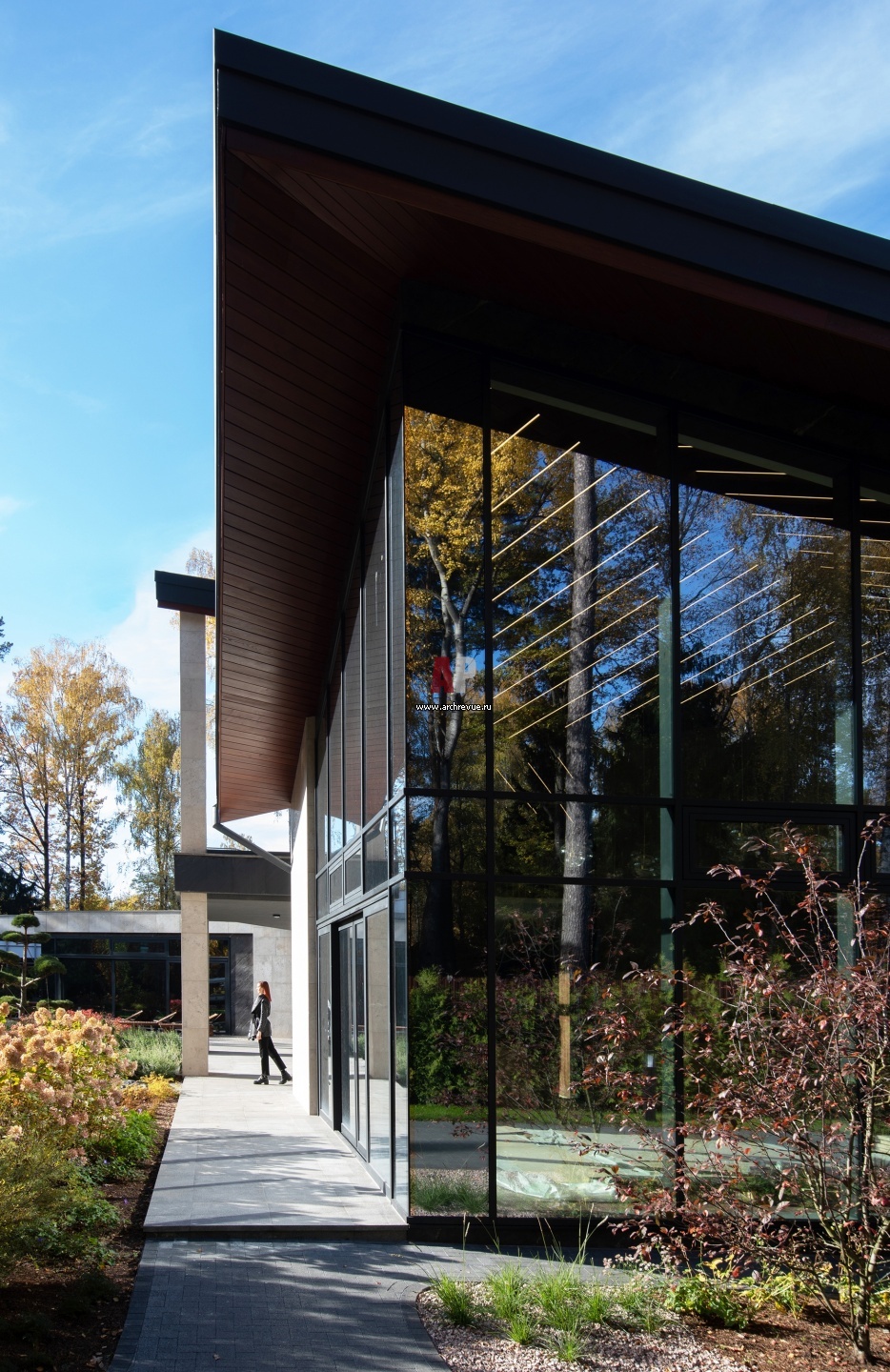 Панорамное остекление, уходящее под кровлю, выполнено с помощью конструкций Schuco, Использованы тонированные энергосберегающие стеклопакеты. Подшивы кровли – натуральная тонированная лиственница.