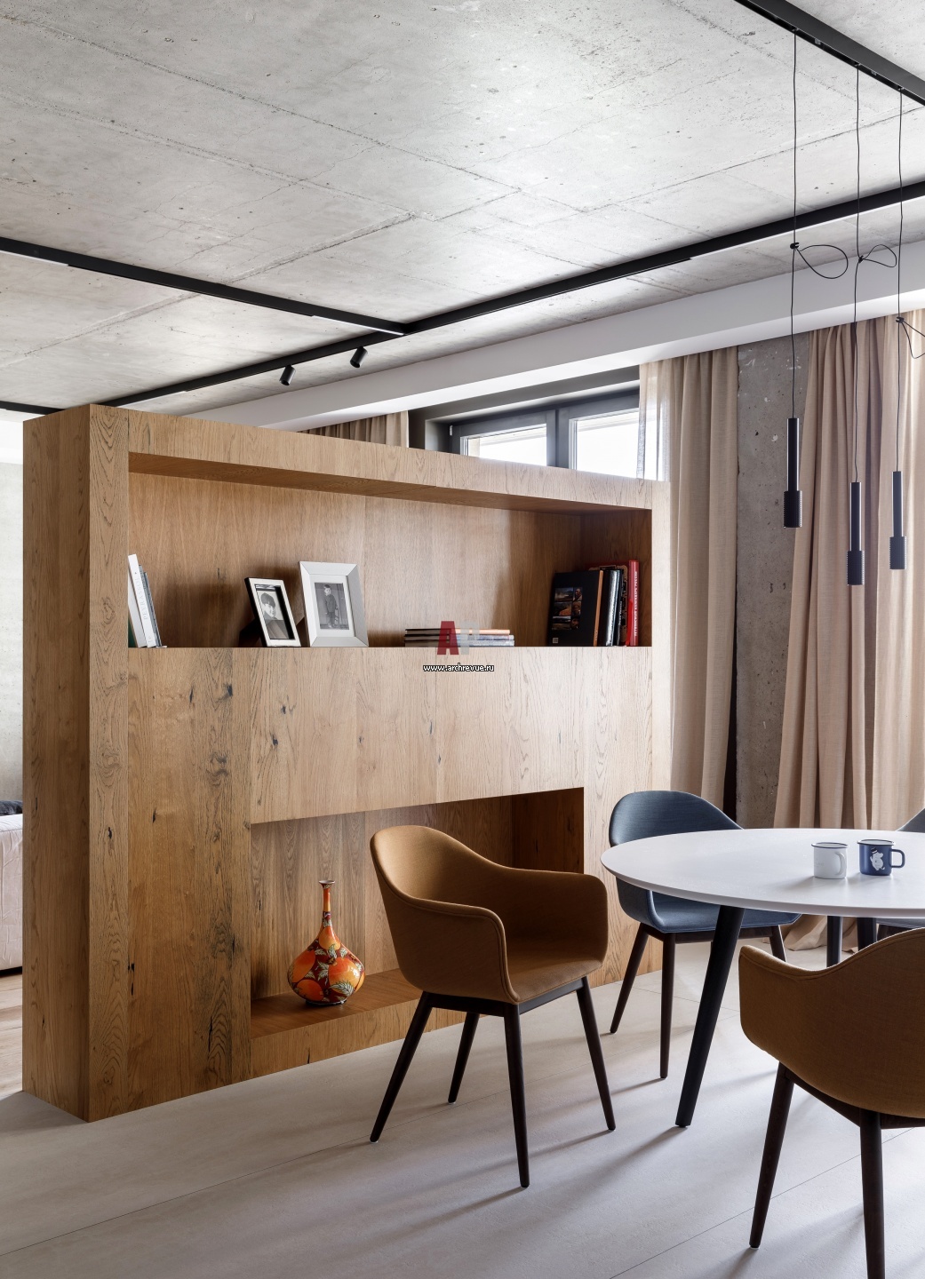 От гостиной зона для завтраков на детской половине отделена лаконичной деревянной перегородкой.