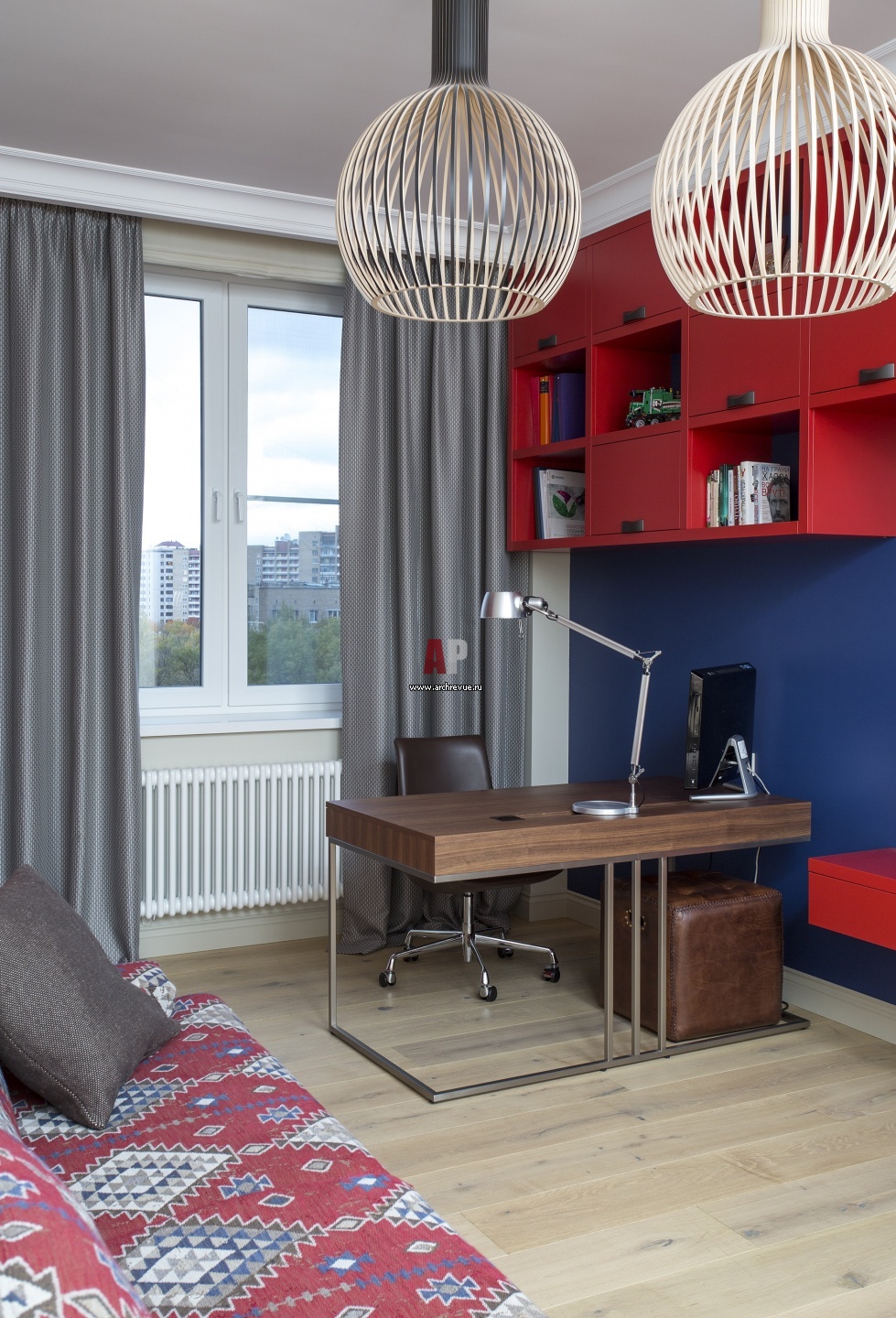 Яркий акцент кабинета – выкрашенная в синий цвет стена с красной модульной системой хранения. Система хранения сделана на заказ, по эскизам автора проекта, изготовление «Столичная Столярная Компания», «Бесст».