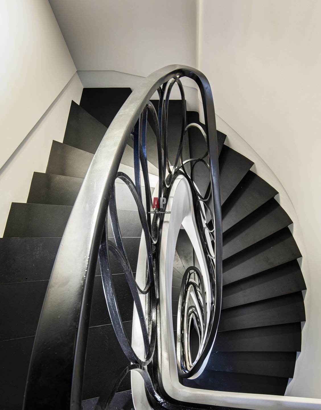 Все четыре этажа объединяет монолитная спиральная лестница и лифт. Лестница была изначально задумана застройщиком, но воплощена не самым лучшим образом, отлита с ошибками, выглядела тяжеловесно. Пришлось конструкцию многократно рихтовать, чтобы добиться большей пластичности и красоты изгибов.