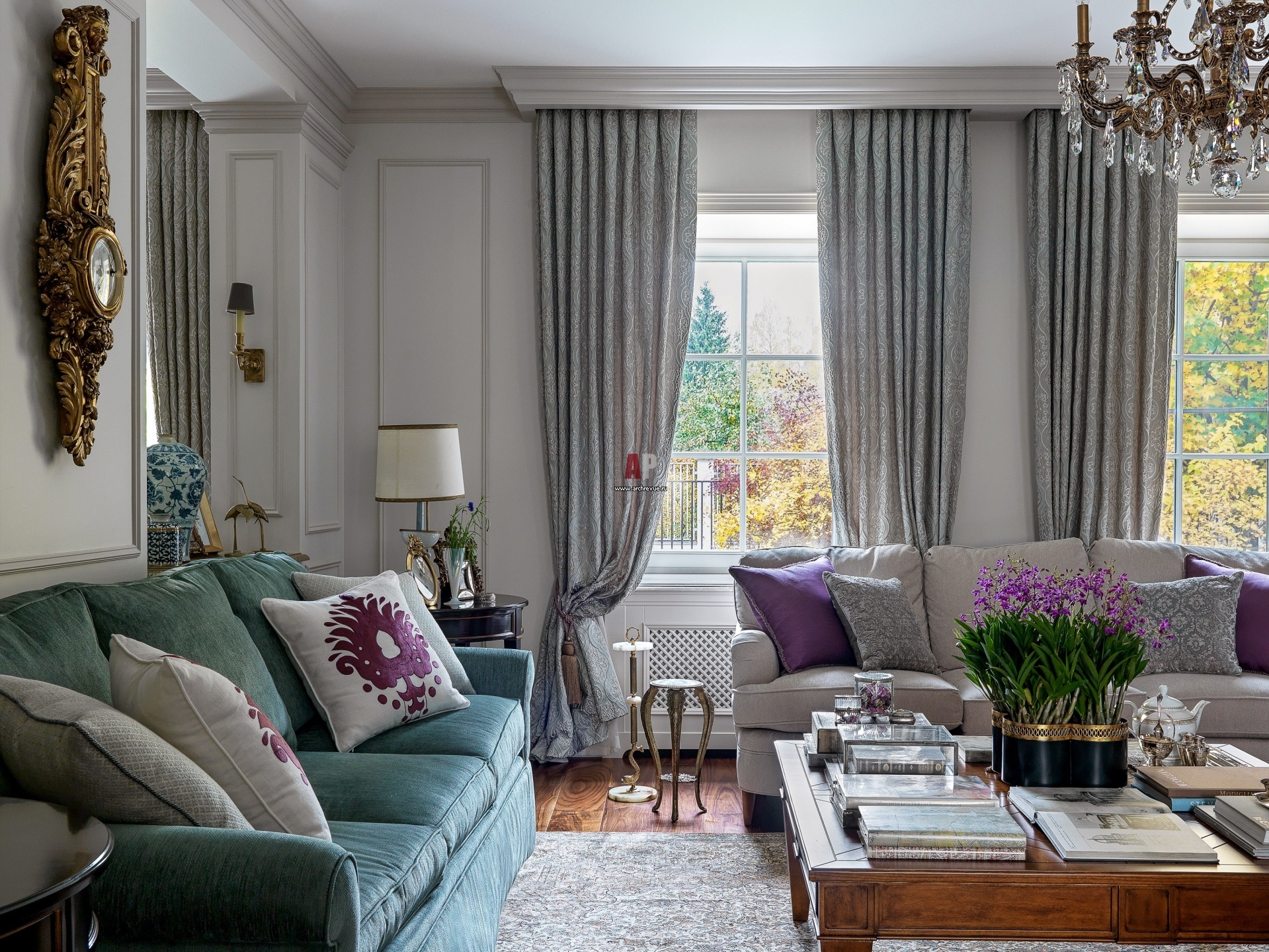 Мягкая мебель подобрана максимально комфортная с учетом высокого роста заказчика. Выбор пал преимущественно на американские бренды, диваны и кресла были изготовлены с измененными размерами для большего удобства.