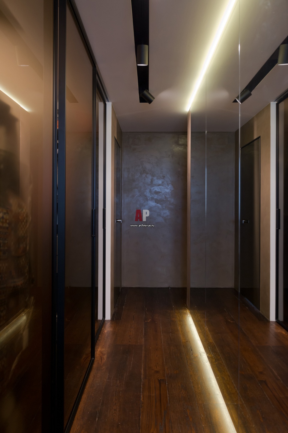 Коридор при хозяйской спальне покрыт декоративной штукатуркой с микроцементом.