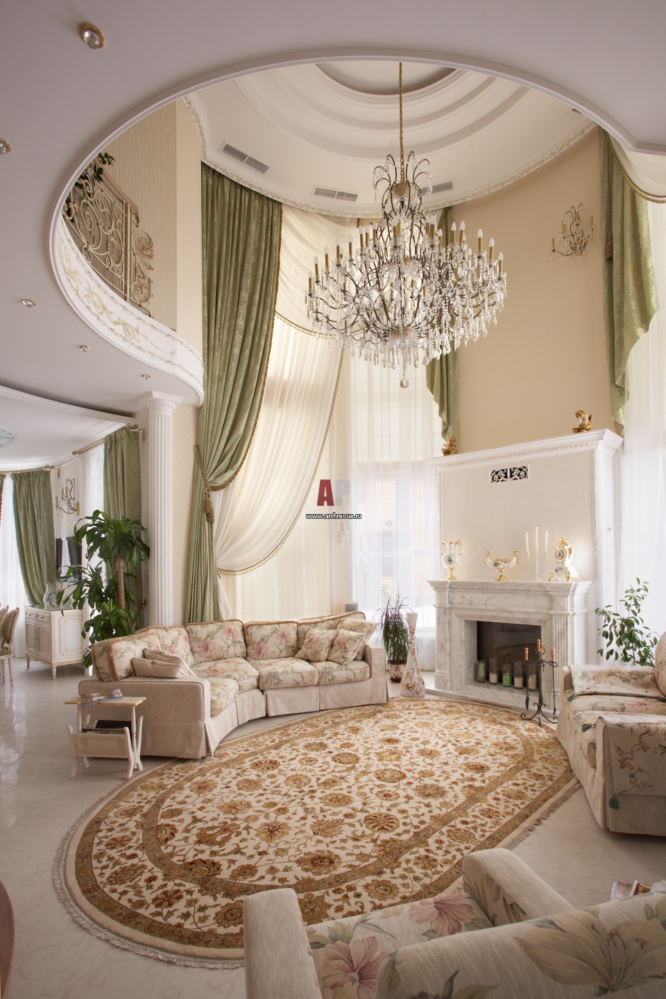 Центральный элемент полукруглой двухсветной гостиной – камин. Он размещен между двумя высокими фасадными окнами. Портал камина из белого камня с серыми прожилками и диваны в цветочной обивке в духе французской неоклассики. Многоярусная хрустальная люстра, Beby Group.