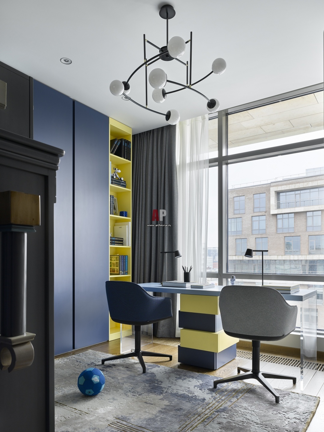 В детской присутствуют синие и желтые оттенки. Встроенная мебель сделана по эскизам дизайнера. Стулья, Vitra. Люстра, MMLampadari.