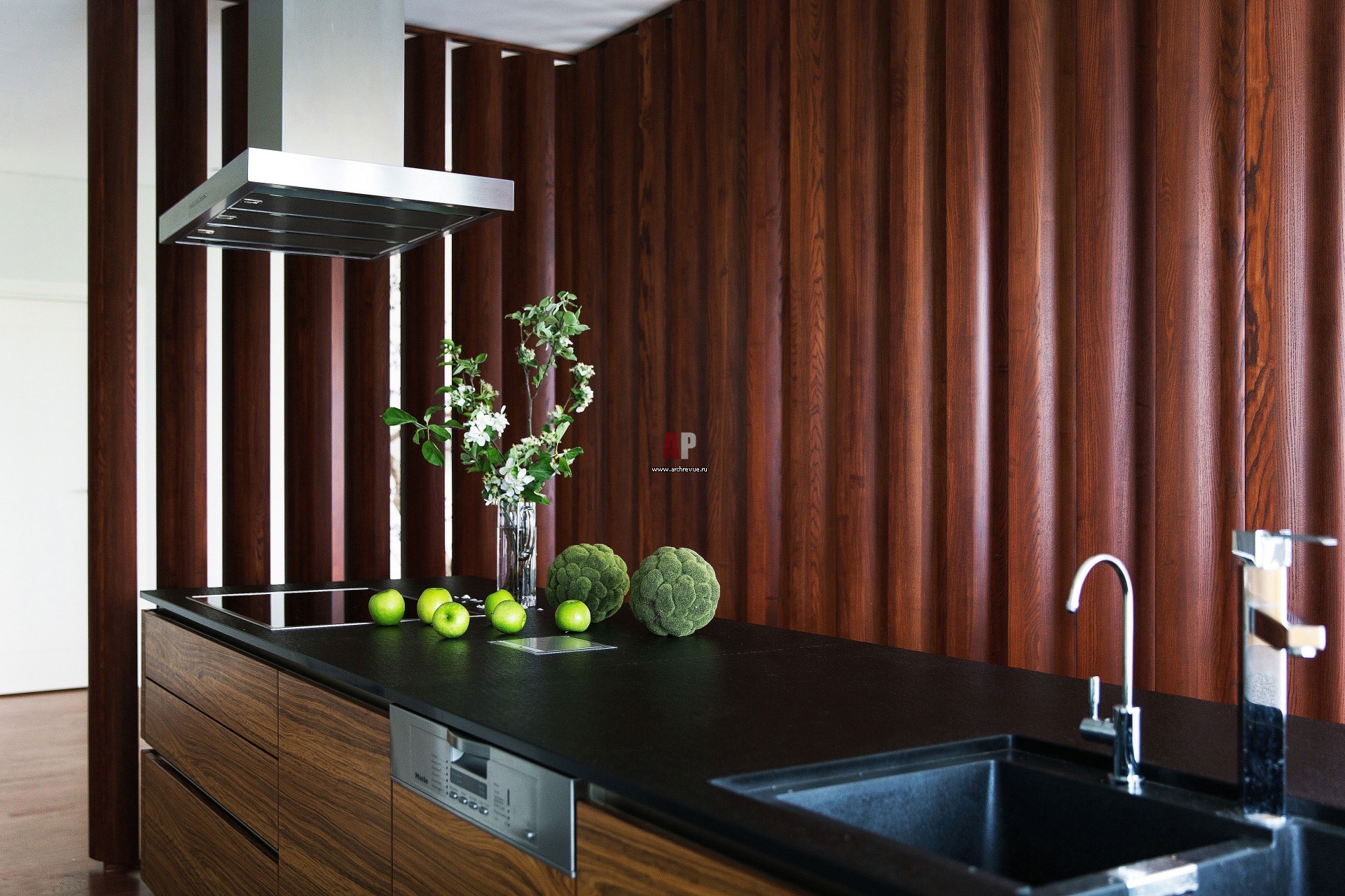 Изначально кухня была расположена по центру общей гостиной. Дизайнер ее обособила с помощью ширмы с вращающимися деревянными ламелями из палисандра.