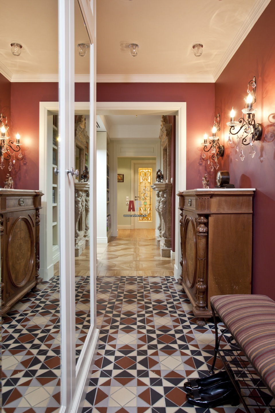 Фото интерьера прихожей с напольным панно из керамической плитки TopCer четырех цветов: винного, лавандового, антрацитового и слоновая кость. Зеркальный встроенный шкаф с белыми переплетами зрительно увеличивает небольшое помещение. Стены выкрашены в винный цвет.