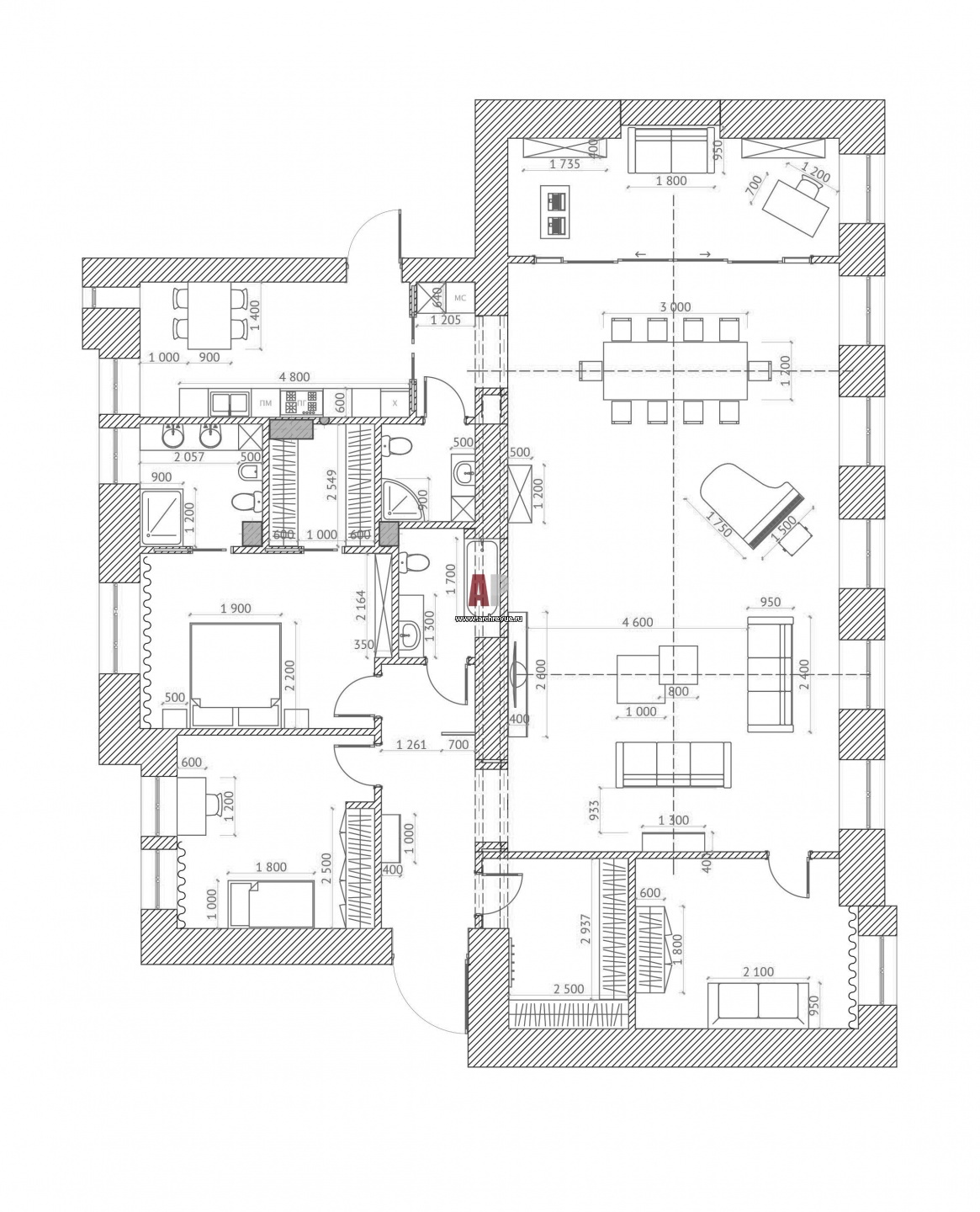 План квартира с гостиной-салоном в дореволюционном доме. Общая площадь – 220 кв. м.
