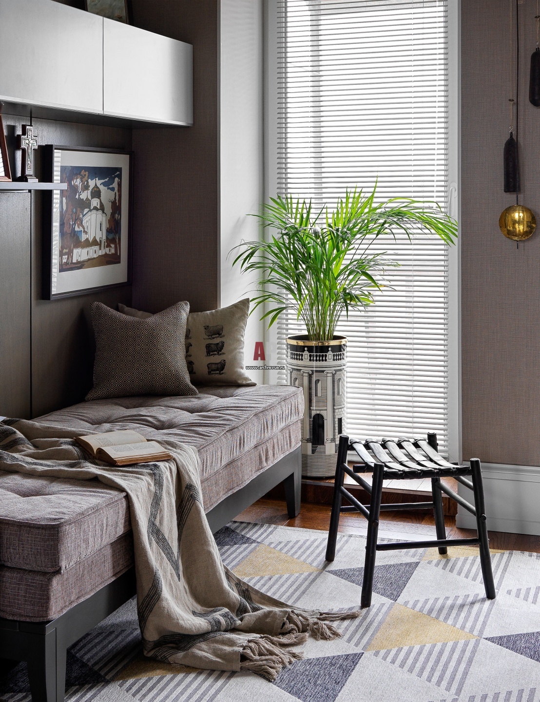 Зона отдыха с кушеткой в кабинете. В квартире использованы настенные панели сложного серого тона в комбинации с однотонными фактурными тканями.